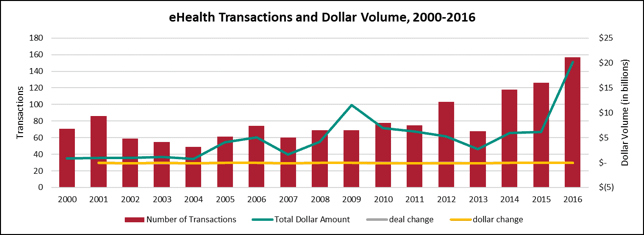 Mergers and acquisitions in the eHealth sector are surging, and data is driving some of the biggest deals in health care. Deal volume in the digital health space went from 68 transactions in 2013 to 157 announced in 2016, a 131% increase. Transaction levels remained in the double-digits from 2000 until 2012, when 103 digital deals were recorded. Since 2014, when annual deal volume reached triple-digits, M&A has grown almost exponentially.