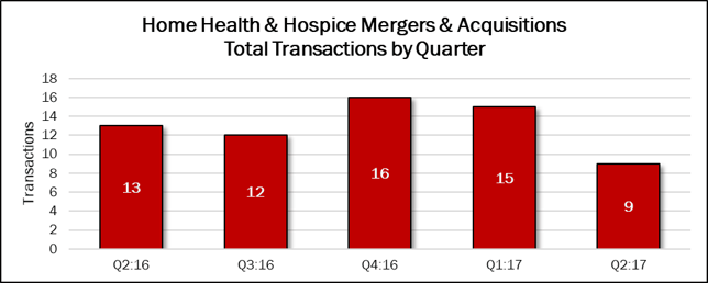 Five publicly traded companies announced deals in this sector in Q2:17. Addus HomeCare (NASDAQ: ADUS) acquired Options Home Care, based in Clovis, New Mexico, a subsidiary of HB Management Group. The price was not disclosed, but the target’s annual revenues were more than $20 million.