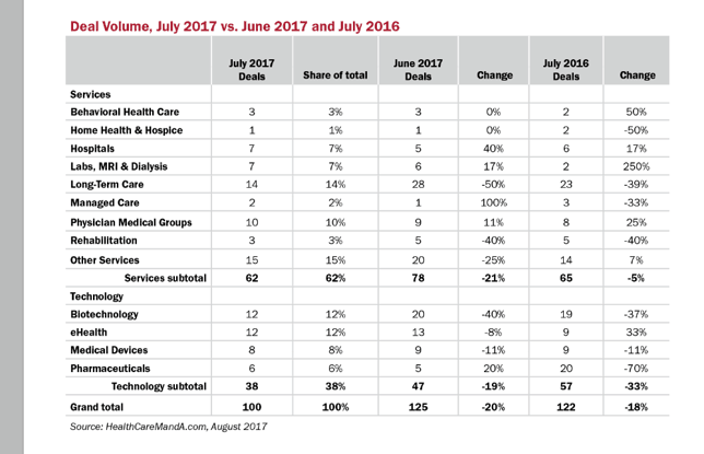 August is often a dead-zone of deal making in the healthcare market and, without the impetus of a new healthcare bill or tax reform, we don’t expect that will change in 2017. Congressional Republicans need to get things moving soon, however. Expect a burst of M&A once they do. □