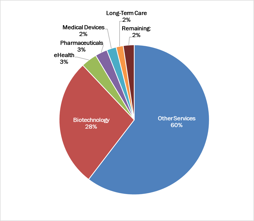 The rest of the healthcare sectors were relegated to single-digit shares of the first quarter’s spending pie. The eHealth ($3.9 billion) and Pharmaceutical ($3.0 billion) sectors contributed 3% of the quarter’s total, followed by the Long-Term Care ($1.7 billion, 2%) and Medical Device ($2.3 billion, 2%) sectors.