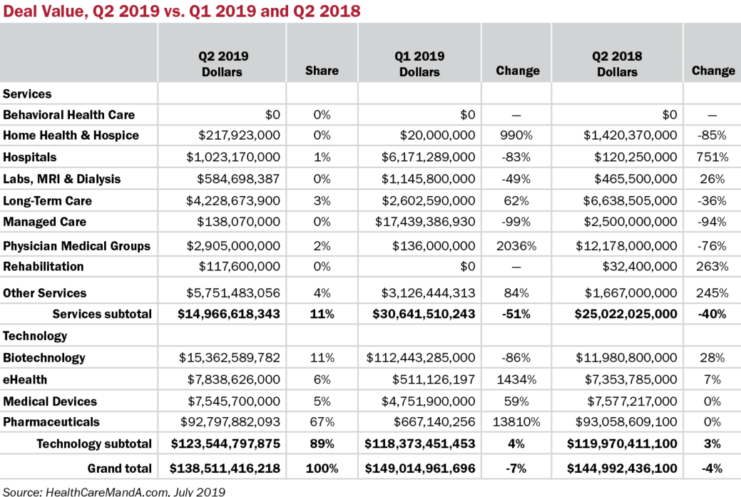 The Long-Term Care sector posted two quarters of 100-plus deals, although second quarter deal volume was off by 3% compared with Q2:18. Among the services sectors, Behavioral Health Care, Home Health & Hospice and Other Services all posted higher deal volume (+10%, 19% and 36%, respectively) compared with a year ago. On the other hand, the Physician Medical Group and Rehabilitation sectors saw M&A activity slow considerably (-56% and -36%, respectively).