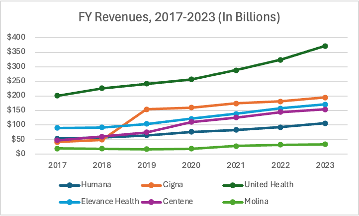 Cigna had an unusual pattern. Its revenue started around $50 billion in 2017 and then jumped by nearly 200% to about $150 billion in 2019 after its March 2018 acquisition of Express Scripts, which integrated pharmacy services into its portfolio. By 2023, Cigna’s revenue stood at approximately $250 billion. This substantial increase sets Cigna apart from the other companies in its sector.