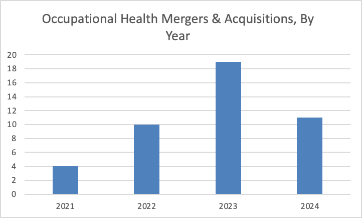 The spike in occupational health M&A from 2022 to 2023 was fueled by a post-COVID emphasis on workplace health. The pandemic heightened awareness of employee well-being, prompting companies to invest in occupational health services to manage workplace safety, comply with evolving regulations and address rising mental health and ergonomic concerns. Private equity firms and strategic buyers (such as Audax Private Equity, Angeles Equity Partners and Concentra) saw opportunities in consolidating a fragmented market, driving deal volumes to unprecedented levels.