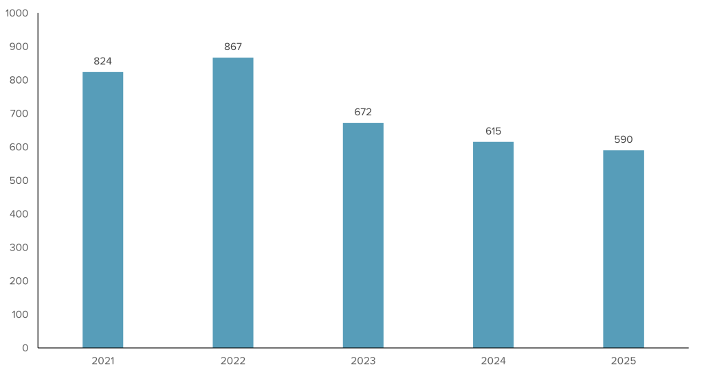 In another preview of our 2026 Healthcare Services Acquisition Report, we’re highlighting private equity investment activity in healthcare services over the past five years. Private equity firms have been the primary drivers of activity for much of the past decade, particularly through roll-up acquisitions by portfolio companies, but our statistics show a waning appetite. Compared with 2021, overall deal volume fell 28% in 2025, to 590 deals. They still accounted for 33% of all deal activity in the healthcare services sector in 2025, down from 44% in 2021. It appears market headwinds, from high interest rates to stricter regulations, have finally caught up with them.
